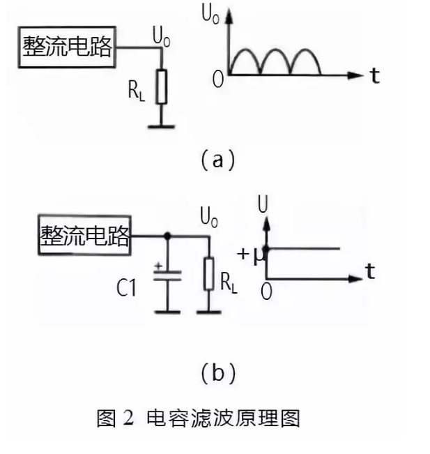 根據(jù)以上的分析,由于單向脈動(dòng)性直流電壓可分解成交流和直流兩部分。在電源電路的濾波電路中,利用電容器的“隔直通交”的特性和儲(chǔ)能特性,或者利用電感“隔交通直”的特性可以濾除電壓中的交流成分。圖 2 所示是電容濾波原理圖。