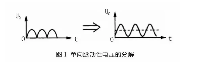 但根據(jù)波形分解原理可知,這一電壓可以分解一個(gè)直流電壓和一組頻率不同的交流電壓,如圖 1(b)所示。在圖 1(b)中,虛線部分是單向脈動(dòng)性直流電壓 U。中的直流成分,實(shí)線部分是 UO 中的交流成分。