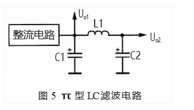 在圖 5 的電路中,整流電路輸出的單向脈動(dòng)性直流電壓先經(jīng)電容 C1 濾波,去掉大部分交流成分,然后再加到 L1 和 C2 濾波電路中。