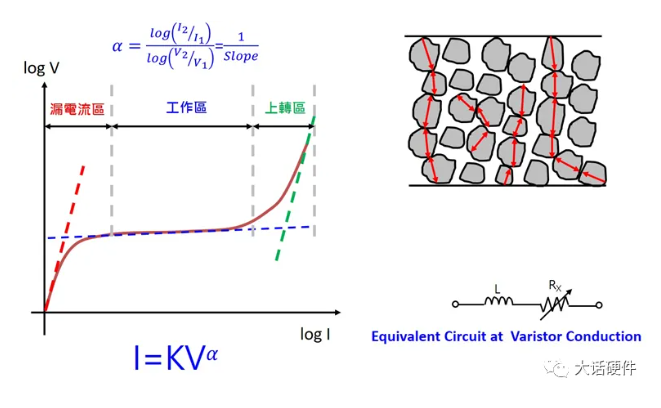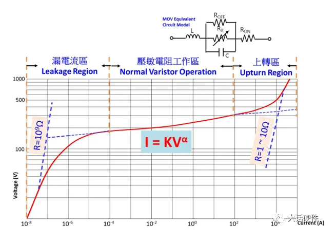壓敏電阻的伏案特性具有非線性,根據(jù)電壓的不同,可以將壓敏電阻的伏案曲線分為三個(gè)部分,漏電流區(qū)(Leakage Region)」、「工作區(qū) (Normal Region)」及「上轉(zhuǎn)區(qū) (Upturn Region)」。