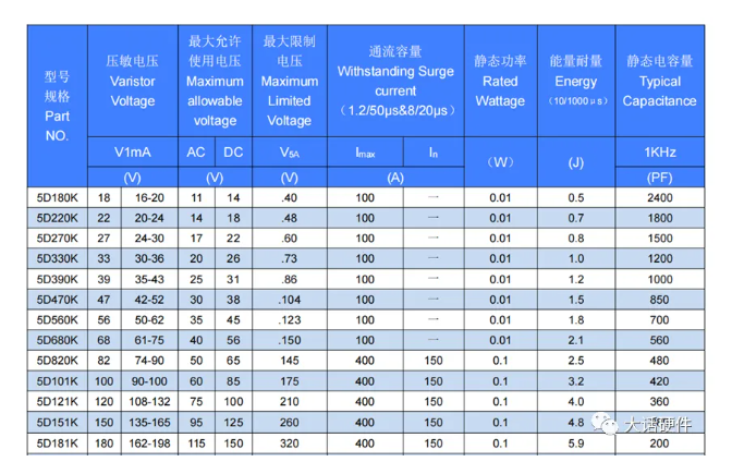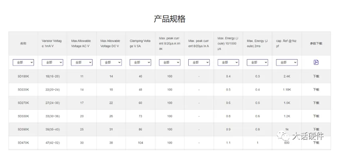 壓敏電阻的關(guān)鍵參數(shù)如下圖所示,來(lái)源于音特電子的官網(wǎng)5D系列的壓敏電阻。