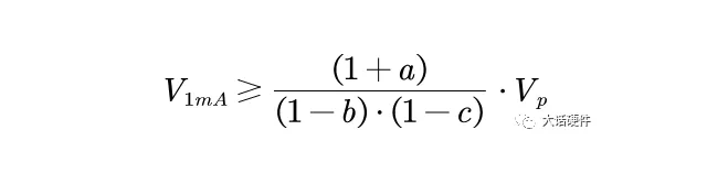 V1mA = 1.35~1.8Vp = 1.9~2.5VAC,Vp為額定電壓峰值,VAC為交流電壓有效值一般會(huì)放寬到:V1mA = (1.8~2.0) Vp = (2.2~2.5) Vp