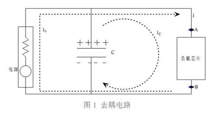 在制作電路板時, 通常會在負載芯片周圍放置很多電容, 這些電容就起到電源退耦作 用。其原理可用圖 1 說明。