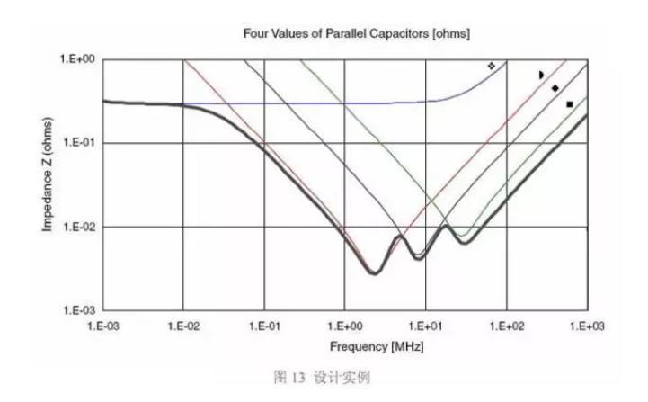 a 不同容值的電容并聯(lián), 其阻抗特性曲線的底部要比圖 10 阻抗曲線的底部平坦得多 (雖 然存在反諧振點,有一個阻抗尖峰) ,因而能更有效地在很寬的頻率范圍內(nèi)小阻抗。