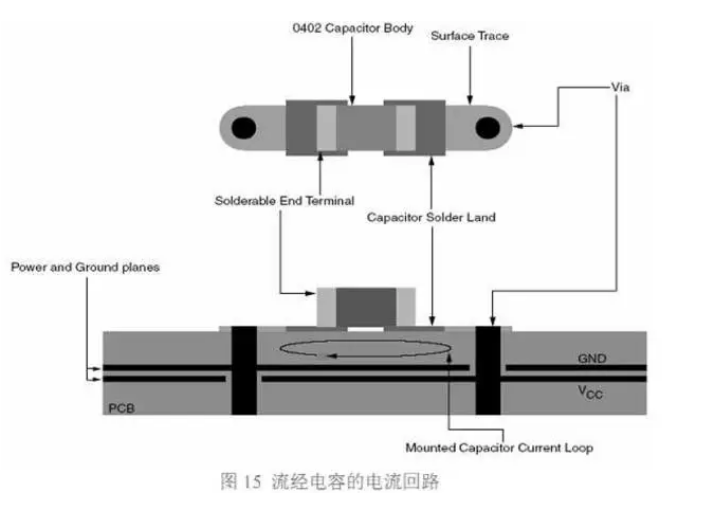在安裝電容時,要從焊盤拉出一小段引出線,然后通過過孔和電源平面連接,接地端也 同樣。這樣流電容的電流回路為:電源平面->過孔->引出線->焊盤->電容->焊盤->引出>過 孔->地平面,圖 15 直觀的顯示了電流的回流路徑。