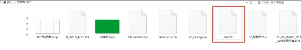 (2)把bin文件放到迪文屏燒錄的文件里, 命名方式采用數(shù)字16-31的數(shù)字開頭,然后就是把.bin改成.DZK,采用此方法的目的,就是把需要更新的單片機(jī)bin程序偽裝成字庫(kù)文件,誘騙迪文屏認(rèn)為此文件就是字庫(kù)文件,下載迪文屏程序的時(shí)候,迪文屏?xí)`認(rèn)為此文件就是字庫(kù)文件,就會(huì)一起存儲(chǔ)到迪文屏的flash里面。