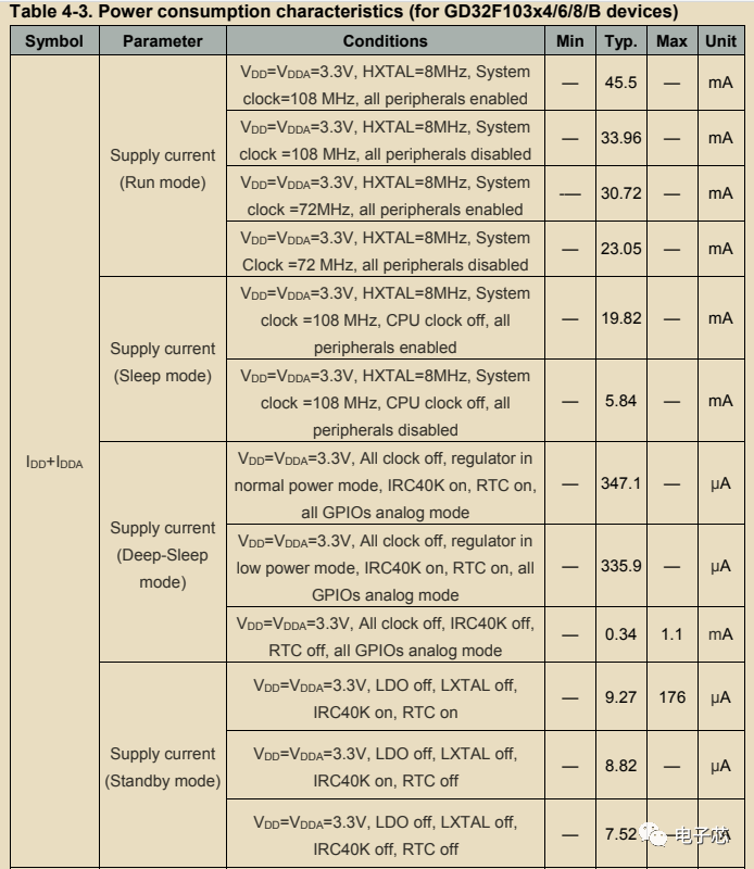 對于所用方案或者說是芯片的功耗到底,同樣還是來到官方手冊中查看相關(guān)數(shù)據(jù)。關(guān)于如何查找數(shù)據(jù)手冊,大家可以看下我之前的文章《大家是如何查找芯片數(shù)據(jù)手冊的?非官網(wǎng)下的手冊是否準確呢?》。那么跟著芯哥來看下GD32某款芯片功耗如何。在數(shù)據(jù)手冊中看到,GD32F103一共有四種模式,分別是運行模式、休眠模式、深度休眠模式、備用模式。那么每個模式的消耗電流以及測試條件都寫的清清楚楚。但是要注意這也是官方自行測試的結(jié)果,不代表你使用之后就完全是一模一樣的功耗,作為參考可以,自己在項目中還需要實際測試。