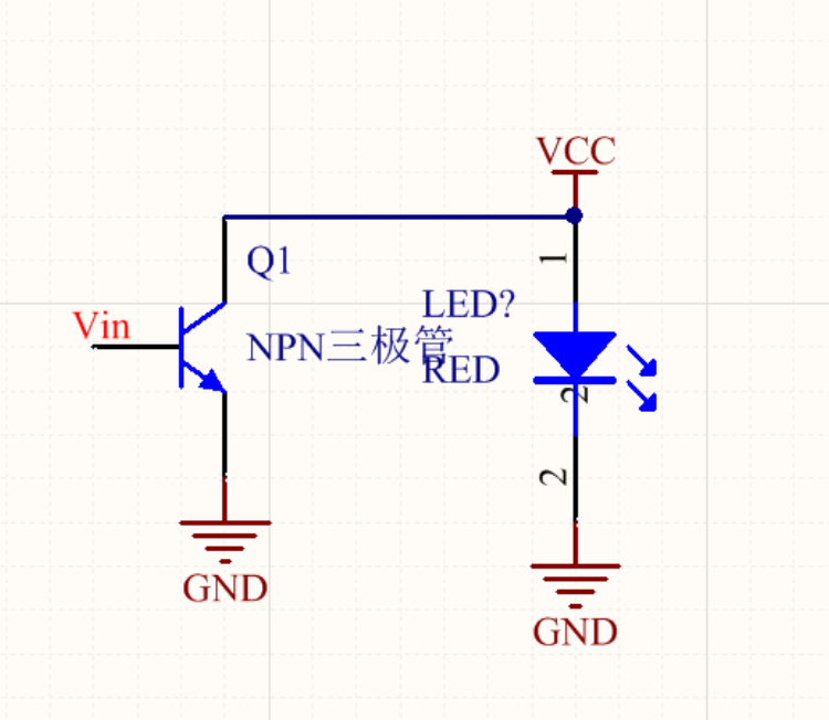 當Vin沒有電流,Q1斷開時,上拉電源給輸入電流,LED亮。當Vin流入電流,Q1導通時,導致led無壓差,LED滅。
