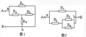 解:設(shè)電流由A端流入,在a點(diǎn)分叉,b點(diǎn)匯合,由B端流出。支路a—R1—b和a—R2—R3(R4)—b各點(diǎn)電勢(shì)逐次降低,兩條支路的a、b兩點(diǎn)之間電壓相等,故知R3和R4并聯(lián)后與R2串聯(lián),再與R1并聯(lián),等效電路如圖2所示。