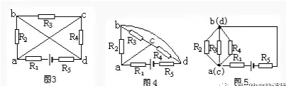 再把連接a、C節(jié)點(diǎn)的導(dǎo)線縮成一點(diǎn),把連接b、d節(jié)點(diǎn)的導(dǎo)線也縮成一點(diǎn),并把R5連到節(jié)點(diǎn)d的導(dǎo)線伸長(zhǎng)線上(圖5)。由此可看出R2、R3與R4并聯(lián),再與R1和R5串聯(lián),接到電源上。