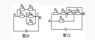 方案三:選取A—R2—R3—C—R4—D—R5—B為一條獨(dú)立支路,再把R1接到AD之間,導(dǎo)線接在C、B之間,如圖21所示,結(jié)果仍無(wú)法直觀判斷電阻的串并聯(lián)關(guān)系,所以選取獨(dú)立支路時(shí)一定要將無(wú)阻導(dǎo)線包含進(jìn)去。