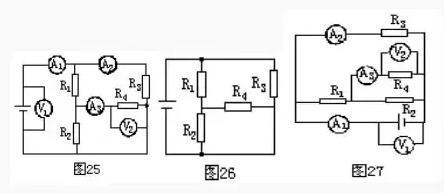 解:先將電流表去,用一根導(dǎo)線代摘替,再摘去電壓表視為開路,得圖26。然后根據(jù)圖25把電流表和電壓表補(bǔ)接到電路中的對(duì)應(yīng)位置上,如圖27所示。