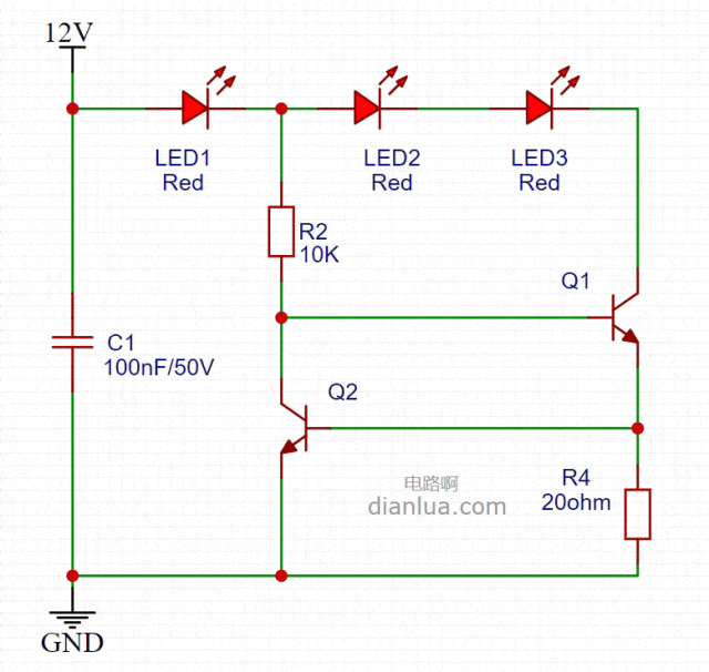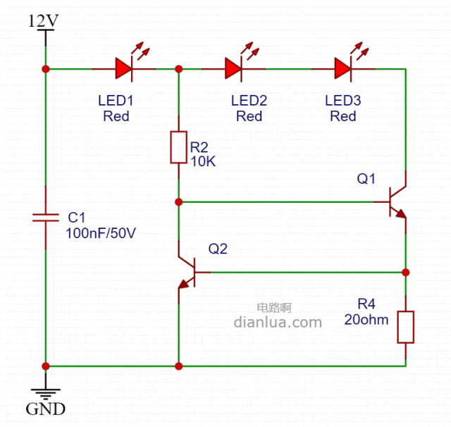 能實現(xiàn)恒流,是因為電阻R4被三極管Q2的基極發(fā)射極(be極)鉗位為0.7V,流過它的電流也就固定為: