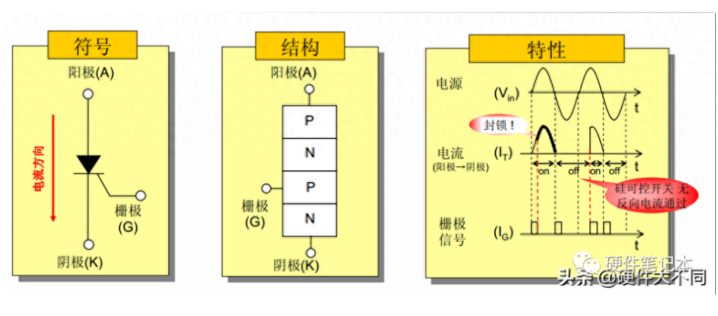 單向可控硅的電流是從陽極流向陰極,交流電過零點時截止,如圖交流電的負半周時,單向可控硅是不導通的,在正半周時,只有控制柵極有觸發(fā)信號時,可控硅才導通。