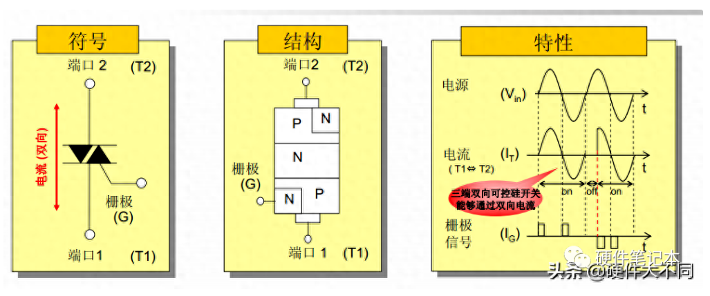 雙向可控硅的電流能從T1極流向T2極,也能從T2極流向T1極,交流電過零點時截止,只有控制極有正向或負向的觸發(fā)信號時,可控硅才導通。