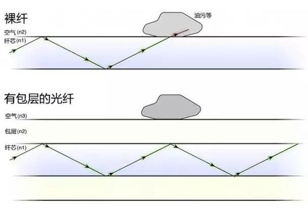可這個(gè)時(shí)候生產(chǎn)的光纖是裸纖,光纖的傳播是利用全內(nèi)反射原理,全內(nèi)反射角由介質(zhì)的折射系數(shù)決定,裸纖會(huì)引起光泄漏,光甚至?xí)恼掣皆诠饫w上的油污泄漏出去。