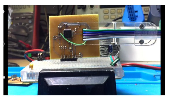 一分鐘之后獲得了兩塊測試PCB電路板,其中有一塊有點過腐蝕。使用另外一塊比較正常的進(jìn)行測試。