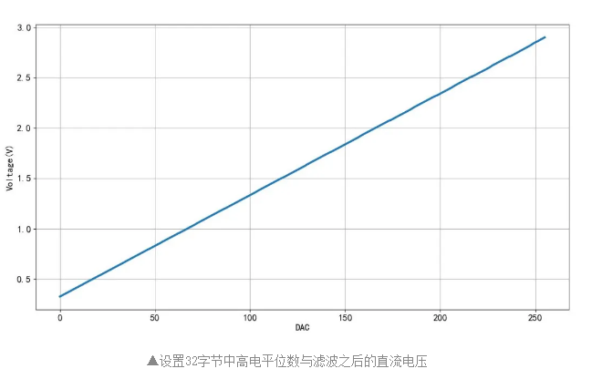 下面分別設(shè)置32個字節(jié)中,高電平位數(shù)從0變化到255,測量濾波之后的輸出直流電壓??梢钥吹诫S著位數(shù)的增加,輸出直流電壓線性上升。由于串口發(fā)送字節(jié)存在著起始位和停止位,所以對應(yīng)的直流信號不是從零開始,最高電平也不是輸出信號的最高值。