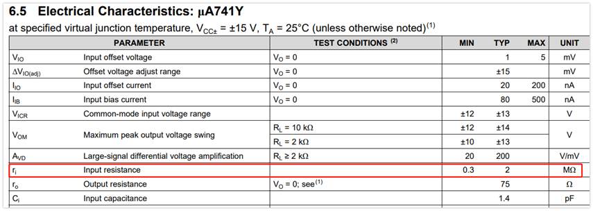 理想運(yùn)放的輸入阻抗無窮大,我們看看實(shí)際運(yùn)放的,還是以Ti的uA741為例,如下圖: