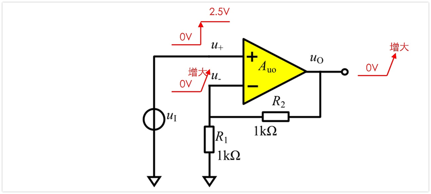 當(dāng)u+瞬間為2.5V后,u-為0V,u+>u-,放大器會(huì)朝著電壓增大的方向進(jìn)行放大,即uo電壓會(huì)開始升高。
