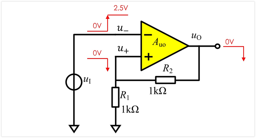 很容易想到,最終的穩(wěn)態(tài)就是uo能輸出多低就是多低,如果是單電源供電,那么uo=0V,此時(shí)u+=0V,而u-=2.5V,顯然,u+不等于u-,也就是說不滿足“虛短”
