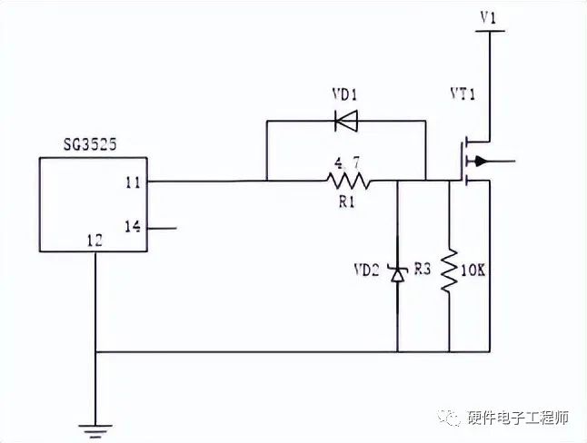 為了減少M(fèi)OS管關(guān)斷時(shí)間從而減少開關(guān)損耗,驅(qū)動(dòng)電路會(huì)要求關(guān)斷時(shí)快速抽取柵極電荷,此時(shí)驅(qū)動(dòng)回路需要一個(gè)低阻抗回路。如圖2中的VD1是快速關(guān)斷二極管,在關(guān)斷時(shí)它直接短路掉和它并聯(lián)的驅(qū)動(dòng)電阻,使得驅(qū)動(dòng)回路的阻抗降低從而快速將柵極電荷抽走。在驅(qū)動(dòng)電阻上并聯(lián)一個(gè)二極管就是一種關(guān)斷加速電路,有時(shí)候二極管可以串聯(lián)一個(gè)合適的電阻,最終達(dá)到MOS管開通和關(guān)斷不同的工作狀態(tài)從而滿足設(shè)計(jì)要求,如下圖7中VD1、R3所示。