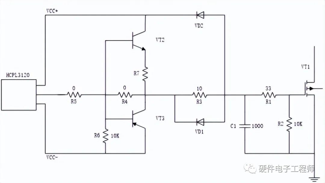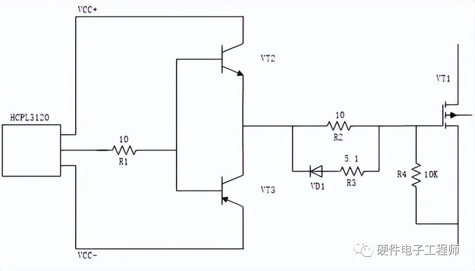 圖6光耦的左側(cè)是控制電路,驅(qū)動(dòng)信號(hào)來自控制芯片。右側(cè)使用隔離的雙電源,同時(shí)增加一級(jí)圖騰柱電路來驅(qū)動(dòng)MOS功率管。MOS管的源極是隔離電源的“地”,而柵極地驅(qū)動(dòng)波形將是相對(duì)于“地”的正或負(fù)脈沖。VD2是一個(gè)電壓嵌位二極管用于保護(hù)MOS管柵源之間的電壓過沖。VD1是加速關(guān)斷二極管。
