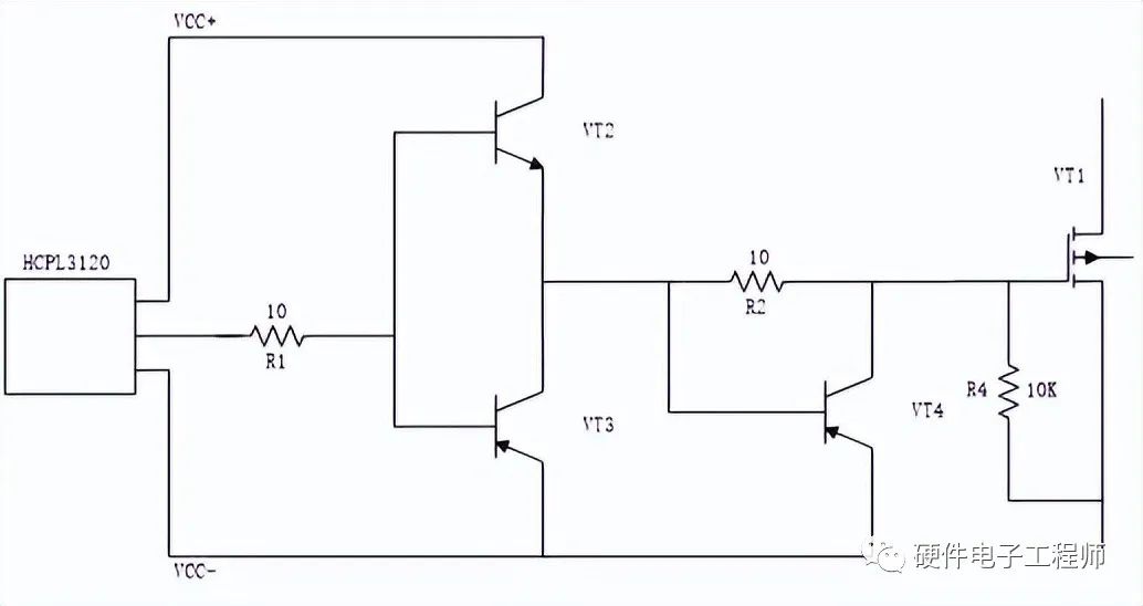 圖3相比圖1和圖2,增加了VT2和VT3組成的圖騰柱電路,圖騰柱電路就是推挽輸出電路。圖騰柱就是上下各一個(gè)三極管,上管為NPN,c極(集電極)接正電源,下管為PNP,c極(集電極)接地。兩個(gè)b極(基極)接一起,接輸入,上管和下管的e極(發(fā)射極)接到一起,接輸出,像一個(gè)“圖騰柱”。用同一信號(hào)驅(qū)動(dòng)兩個(gè)b極。驅(qū)動(dòng)信號(hào)為高時(shí),NPN導(dǎo)通;信號(hào)為低時(shí),PNP導(dǎo)通。利用兩個(gè)晶體管構(gòu)成推挽輸出以增強(qiáng)驅(qū)動(dòng)能力。