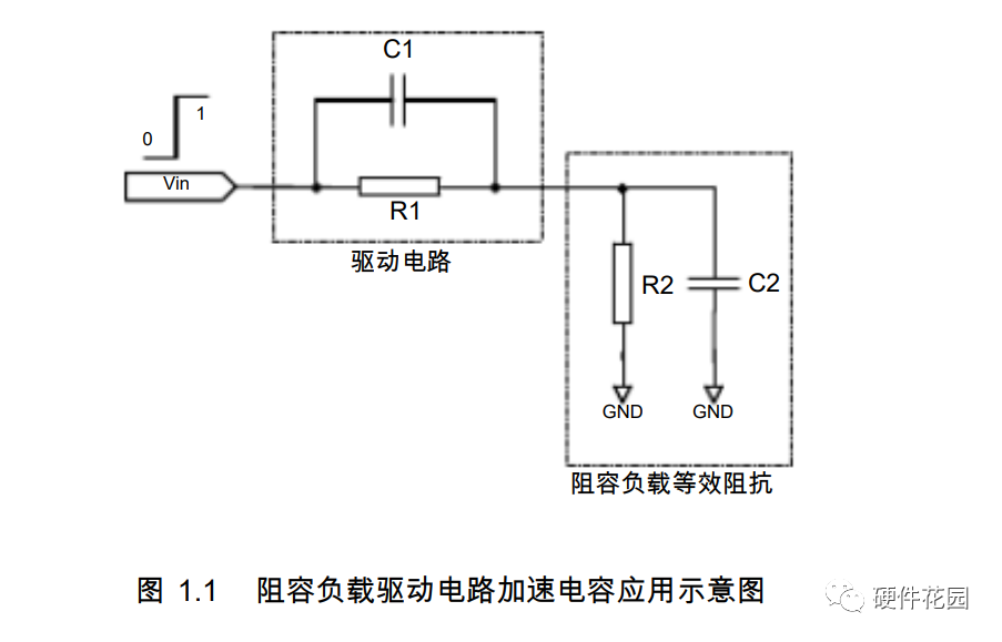 如圖1.1為阻容負載驅(qū)動電路的加速應(yīng)用, R2和C2分別是負載端的等效電阻和等效電容,驅(qū)動電路中串入的電阻R1一般起到限制電流或穩(wěn)定電路等作用,并聯(lián)在R1電阻兩端的C1 是加速電容。
