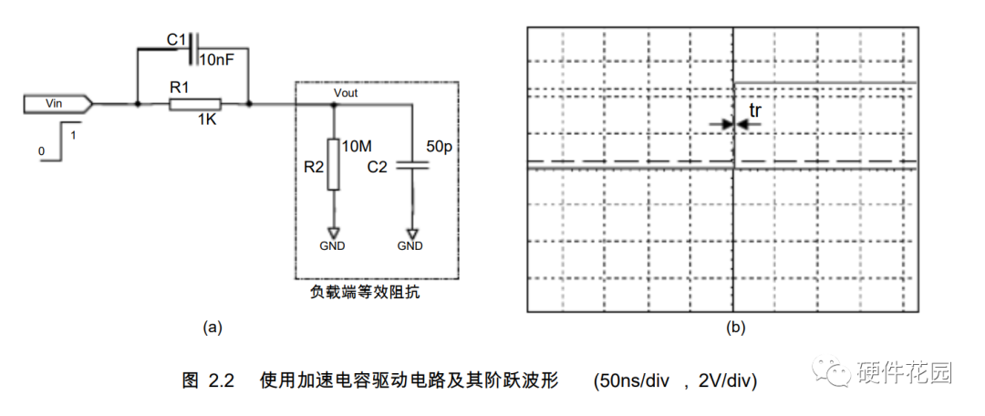 如圖2.2(a)所示,為使用加速電容的驅(qū)動電路示意圖。電阻R1兩端并聯(lián)了一個加速電容C1,當(dāng)階躍開始時由于C1電容兩端的電壓不能突變將電阻R1短路,所以不存在電阻對電容充電的過程,Vout電壓可以迅速變化。