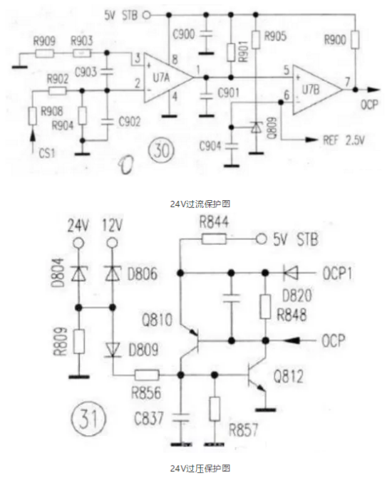 3、保護(hù)回路:U1芯片本身和3腳外圍電路構(gòu)成過(guò)流保護(hù)回路;N1繞組上并聯(lián)的D1、R1、C9元件構(gòu)成了開(kāi)關(guān)管的反向電壓吸收保護(hù)電路,以提供Q1截止時(shí)的反向電流通路,保障Q1的工作安全;實(shí)質(zhì)上穩(wěn)壓回路的電壓反饋信號(hào),也可看作是一路電壓保護(hù)信號(hào)——當(dāng)反饋電壓幅度達(dá)一定值時(shí),電路實(shí)施停振保護(hù)動(dòng)作;24V的輸出端并聯(lián)有由R18、ZD2、單向晶閘管SCR組成的過(guò)壓保護(hù)電路,當(dāng)穩(wěn)壓電路失常,引起輸出電壓異常上升時(shí),穩(wěn)壓二極管ZD2的擊穿為SCR提供觸發(fā)電流,SCR的導(dǎo)通形成一個(gè)“短路電流”信號(hào),強(qiáng)制U1內(nèi)部保護(hù)電路產(chǎn)生過(guò)流保護(hù)動(dòng)作,電路處于停振狀態(tài)。