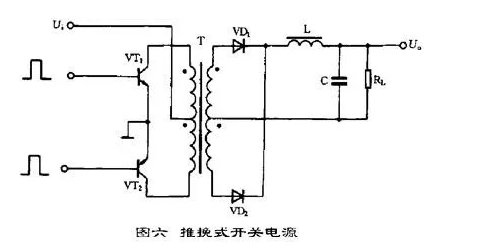 推挽式開(kāi)關(guān)電源的典型電路如圖六所示。它屬于雙端式變換電路,高頻變壓器的磁芯工作在磁滯回線的兩側(cè)。電路使用兩個(gè)開(kāi)關(guān)管VT1和VT2,兩個(gè)開(kāi)關(guān)管在外激勵(lì)方波信號(hào)的控制下交替的導(dǎo)通與截止,在變壓器T次級(jí)統(tǒng)組得到方波電壓,經(jīng)整流濾波變?yōu)樗枰闹绷麟妷骸?