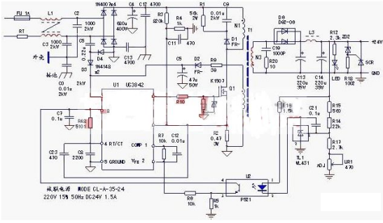 2、穩(wěn)壓回路:開(kāi)關(guān)變壓器的N3繞組、D6、C13、C14等元件組成的24V電源,基準(zhǔn)電壓源TL1、光耦合器U2等元件構(gòu)成了穩(wěn)壓控制回路。U1芯片和1、2腳外圍元件R7、C12,也是穩(wěn)壓回路的一部分。實(shí)際上,TL1、U1組成了(相對(duì)于U1內(nèi)部電壓誤差放大器)外部誤差放大器,將輸出24V的電壓變化反饋回U1的反饋電壓信號(hào)輸入端。當(dāng)24V輸出電壓上升時(shí),U1的2腳電壓上升,1腳電壓下降,輸出PWM脈沖占空比下降,輸出電路回落。當(dāng)輸出電壓異常上升時(shí),U1的1腳下降為1V時(shí),內(nèi)部保護(hù)電路動(dòng)作,電路停振。