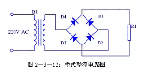 (3)橋式整流電路由于全波整流電路需要特制的變壓器,制作起來比較麻煩,于是出現(xiàn)了一種橋式整流電路。這種整流電路使用普通的變壓器,但是比全波整流多用了兩個整流二極管。由于四個整流二極管連接成電橋形式,所以稱這種整流電路為橋式整流電路。