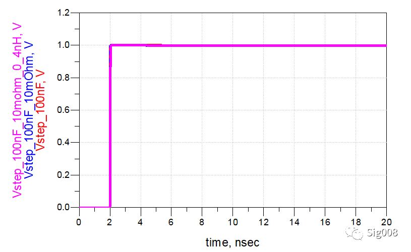 下面看一下在100nF的電容后面緊跟著一個(gè)10 mOhm的電阻,波形如下: