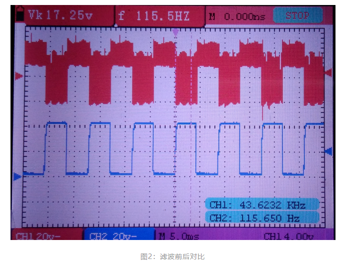 ?圖2、圖3、圖4是實(shí)測(cè)無(wú)刷電機(jī)霍爾信號(hào)濾波前后的波形對(duì)比,紅色波形代表霍爾信號(hào)濾波前的;藍(lán)色波形代表霍爾信號(hào)濾波后的。濾波前的毛刺異常恐怖。