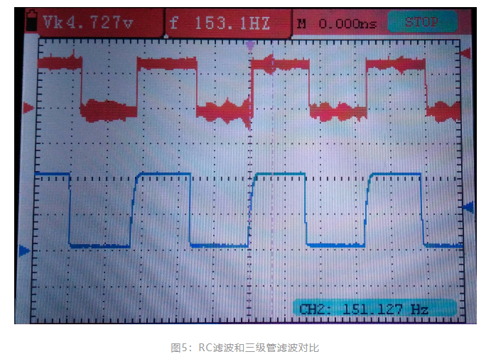?圖5是實(shí)測(cè)無(wú)刷電機(jī)霍爾信號(hào)經(jīng)過(guò)RC濾波后和三級(jí)管后濾波的波形對(duì)比,紅色波形代表霍爾信號(hào)經(jīng)過(guò)RC濾波后的,藍(lán)色波形代表霍爾信號(hào)經(jīng)過(guò)RC濾波再經(jīng)過(guò)三極管濾波后的;