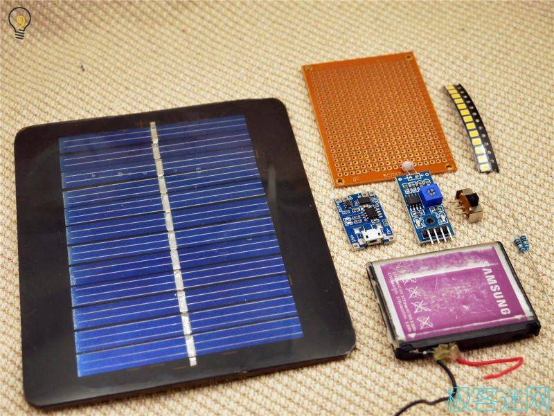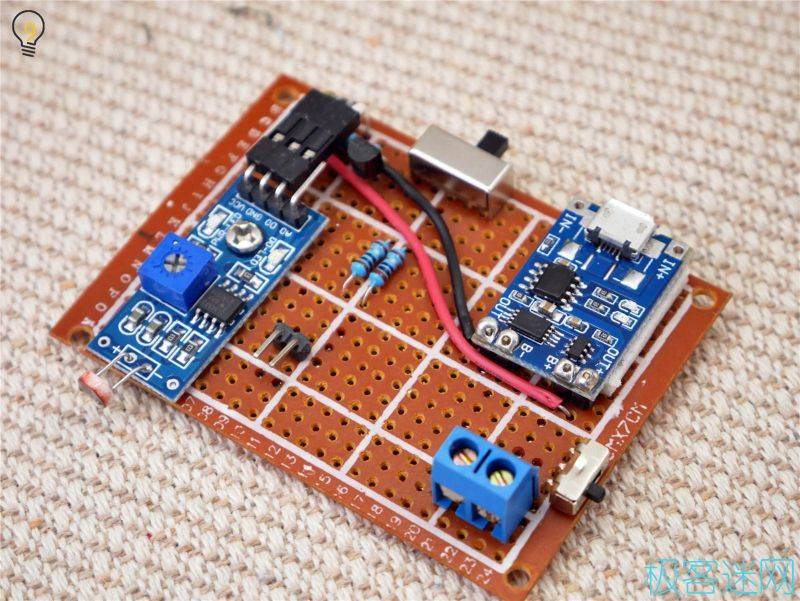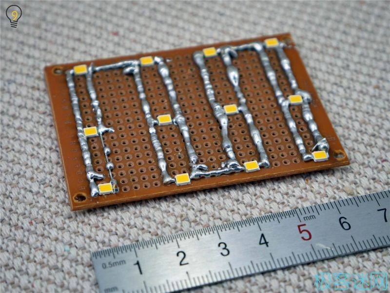 1.用電烙鐵將LED牢牢地焊在第一塊洞洞板上(并聯(lián)),這個過程比較復雜,如果嫌麻煩的話可以在購物網(wǎng)站上找一些現(xiàn)成的燈板,甚至可以找?guī)в泻懔黩寗拥腖ED板,這種情況下只使用三個現(xiàn)成的模塊(充電、光敏、LED)就能完成整個制作。
