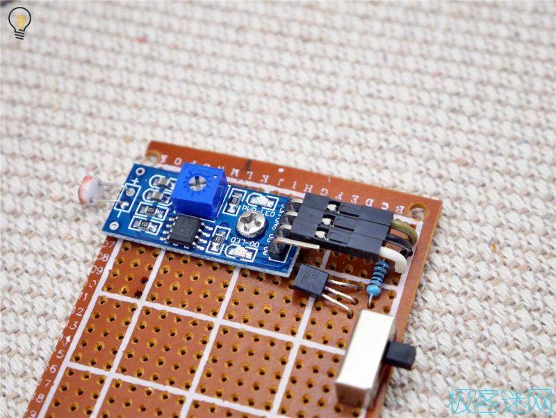 2.將光敏模塊焊接到洞洞板上之后,由于模塊輸出能力不足,需要額外添加一枚三極管進行擴流(使用S8050即可)這里需要你能對三極管基極(B)、集電極(C)、發(fā)射極(E)有所了解,如果無法正常工作則可以添加一枚10K的上拉電阻(用電阻將B極與電源+連接)。