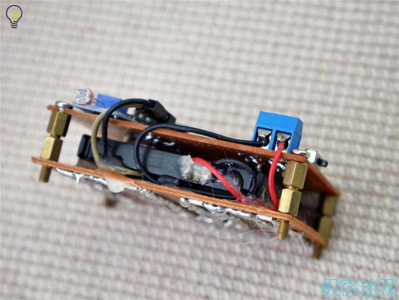 7.最后將上下兩部分組合,主體就完成的差不多了,已經(jīng)能開機進行測試,記得在此時將光敏模塊的靈敏度調整至合適,可以在拉上窗簾的室內使用臺燈進行測試。