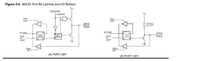 在51單片機(jī),沒有連接上拉電阻的P0口相比有上拉電阻的P1口在I/O口引腳和電源之間相連是通過一對推挽狀態(tài)的FET來實(shí)現(xiàn)的,51具體結(jié)構(gòu)如下圖。