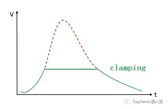 Vc (Clamping Voltage) 鉗位電壓。這也是一個(gè)重要指標(biāo),就是當(dāng)一個(gè)電壓很高的脈沖來(lái)了,TVS器件從截止?fàn)顟B(tài),變?yōu)閷?dǎo)通狀態(tài),電壓被鉗制在一個(gè)比較低的水平,電流從TVS通過(guò),回流到地,從而保護(hù)了后級(jí)電路。