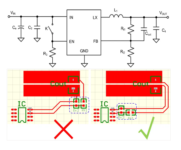 相對來說阻抗越高的位置, 越容易被干擾。如下為一同步降壓芯片的PCB阻抗位置設(shè)計。