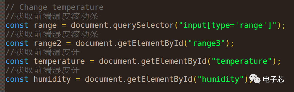 接下來對濕度數(shù)據(jù)進(jìn)行提取,之前的溫度計(jì)中已經(jīng)接收到數(shù)據(jù),所以非常方便。在js代碼中獲取到前端的控件,包括濕度計(jì)高度和數(shù)據(jù)顯示。如下端代碼的range2和humidity。