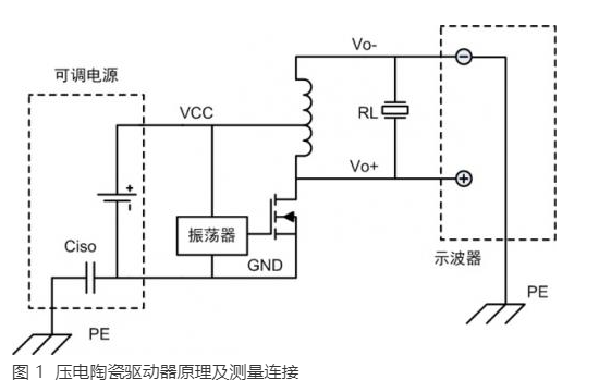 客戶的產(chǎn)品是一個(gè)壓電陶瓷及其驅(qū)動(dòng)電路,圖 1 是產(chǎn)品原理和測(cè)試連接圖,開關(guān)管以約 100kHz 的頻率通斷,帶抽頭的電感實(shí)現(xiàn)升壓功能驅(qū)動(dòng)壓電陶瓷片,電感與容性負(fù)載形成諧振使開關(guān)管處于軟開關(guān)狀態(tài)。