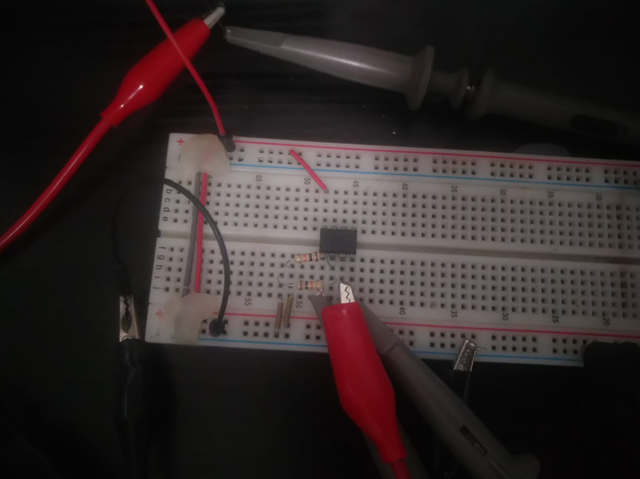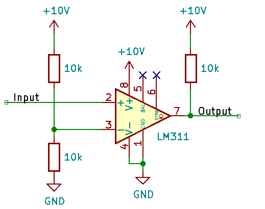 兩個10k 電阻構成分壓器接到反相輸入引腳,提供一個比較參考電壓 5 伏。正弦信號輸入到同相引腳。同相輸入引腳我們輸入一個以 5 伏為中心的正弦波,這會在輸出引腳輸出一個方波。