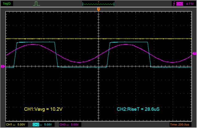下圖中黃色波形是運放比較器電路的輸出,青色波形是比較器芯片輸出波形: