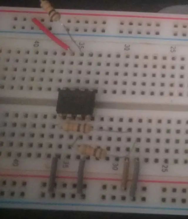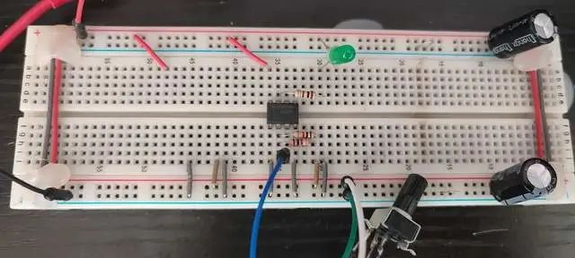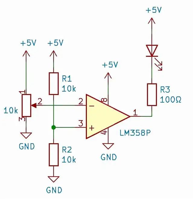 兩個 10k 的電阻構成的分壓器為同相引腳提供 2.5 伏的比較參考電壓??烧{電阻接到反相引腳,其可調電壓范圍為 0~5 伏: