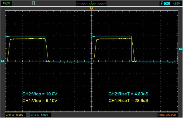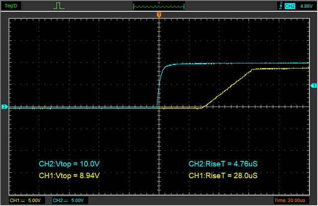 我們測量波形的上升時間,即波形從10% 上升到 90% 所需的時間??梢钥吹奖容^器以 4.76 微秒的速度快速上升。受限于較低其壓擺率,運放的上升時間達到了 28 微妙。