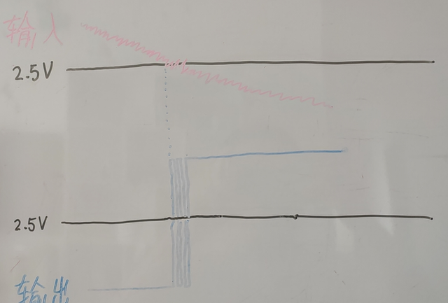 可以看到輸入信號在接近參考電壓 2.5 伏時,其上面的噪音會在 2.5 伏上下抖動,導致輸出也跟著抖動。